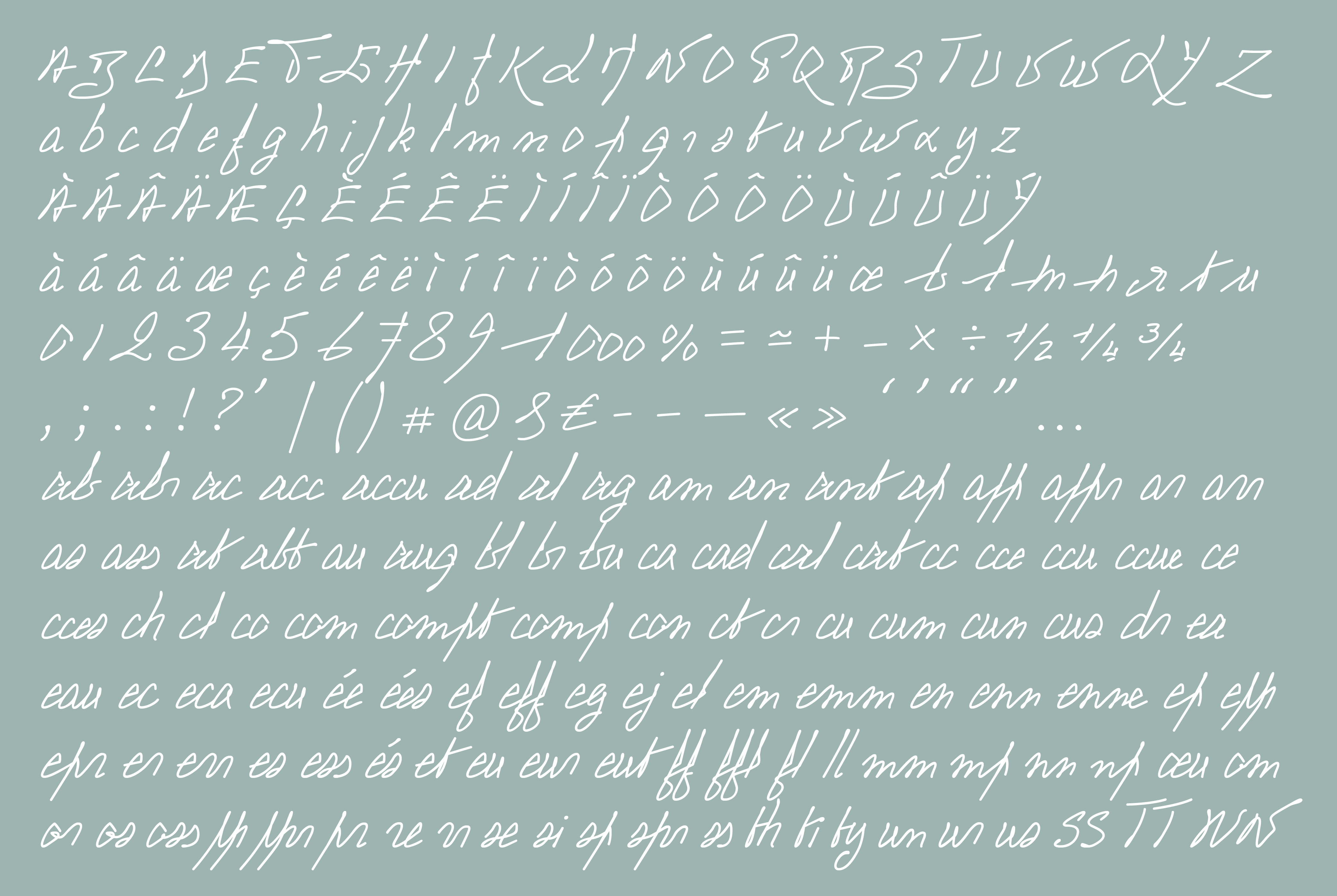 Je n’arrive pas à savoir si mon père écrit bien, ou mal… mais ce qui est sûr c’est que son écriture est singulière, et c’est ce qui m’intéresse ! Comme cadeau de départ en retraite, j’ai choisi de redessiner fidèlement son écriture manuscrite et de la stabiliser sous forme d’un caractère typographique baptisé le «Paternel». Au delà de l’alphabet, des chiffres et de la ponctuation, ce caractère comporte également plus d’une centaine de ligatures, accentuant le côté manuscrit du tracé. Des lettres «alternates» (variantes), sont aussi dessinées et permettent de donner l’aspect irrégulier et aléatoire aux lettres. Certains détails originaux sont également retranscrits, comme l’esperluette (&) traçée à l’envers.