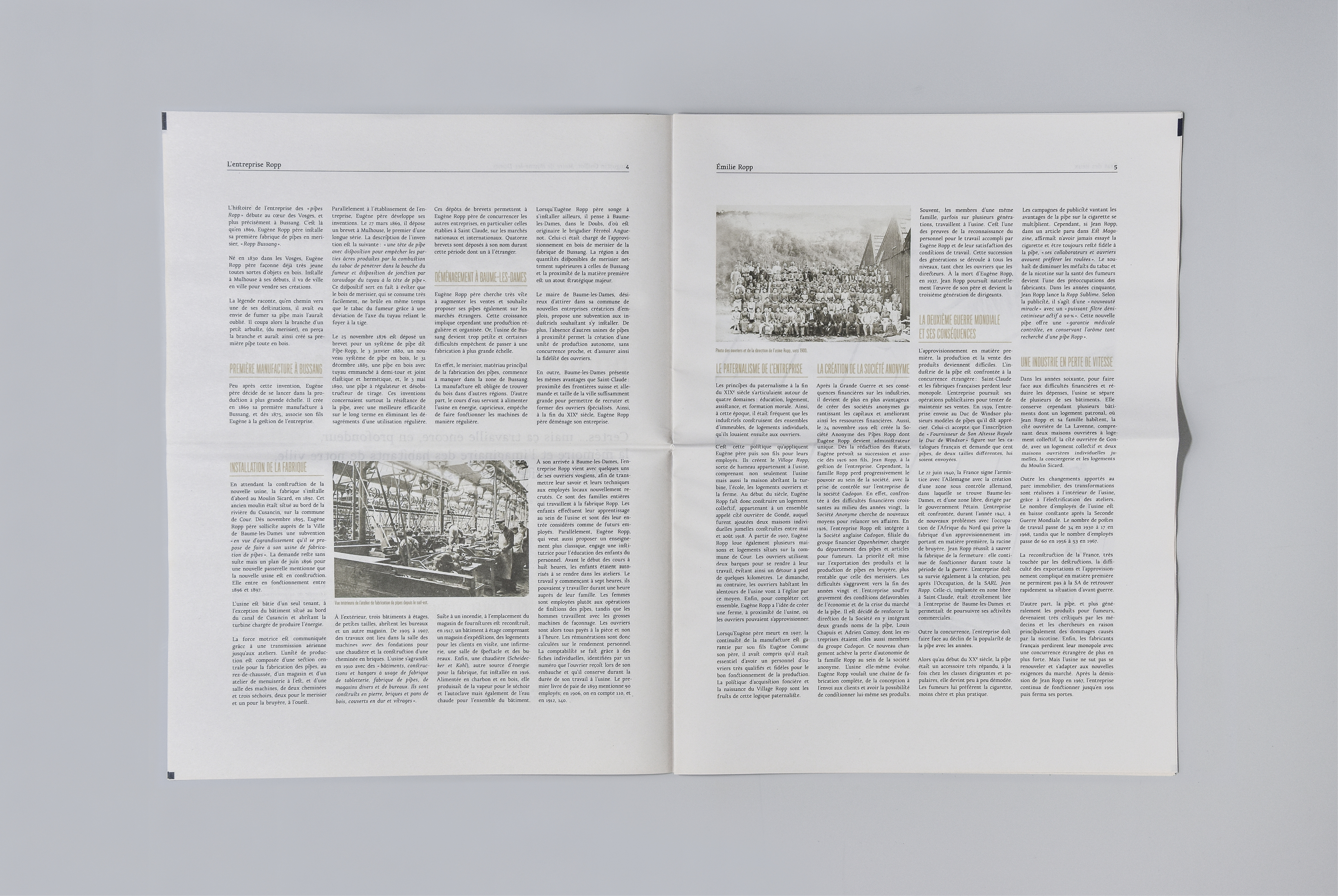 Catalogue de l’exposition «Ropp, ça ne fume plus», consacré au patrimoine industriel de l’ancienne usine des pipes Ropp, située à Baume-les-Dames (Doubs), retraçant un historique de l’entreprise Ropp, rédigé par Émilie Ropp, et présentant un travail photographique réalisé par Romain Bassenne. La mise en page des images qui oppose les deux séries (État des lieux / Inventaire), permet de confronter le noir et blanc à la couleur, l’argentique au numérique, le reportage à la photo de studio, et de recréer un dialogue et des liens étroits entre lieux et objets. De la même manière que le découpage du chemin de fer, le livre est composé de deux types de papiers, un papier offset pour la partie éditoriale, et un couché 1/2 mat pour les photographies. Imprimé à 500 exemplaires, le livre a également fait l’objet d’une reliure à part limitée à 100 exemplaires, avec une reliure Suisse permettant d’y inscrire (à l’intérieur même du dos) l’achevé d’imprimer ainsi que le numéro du tirage.