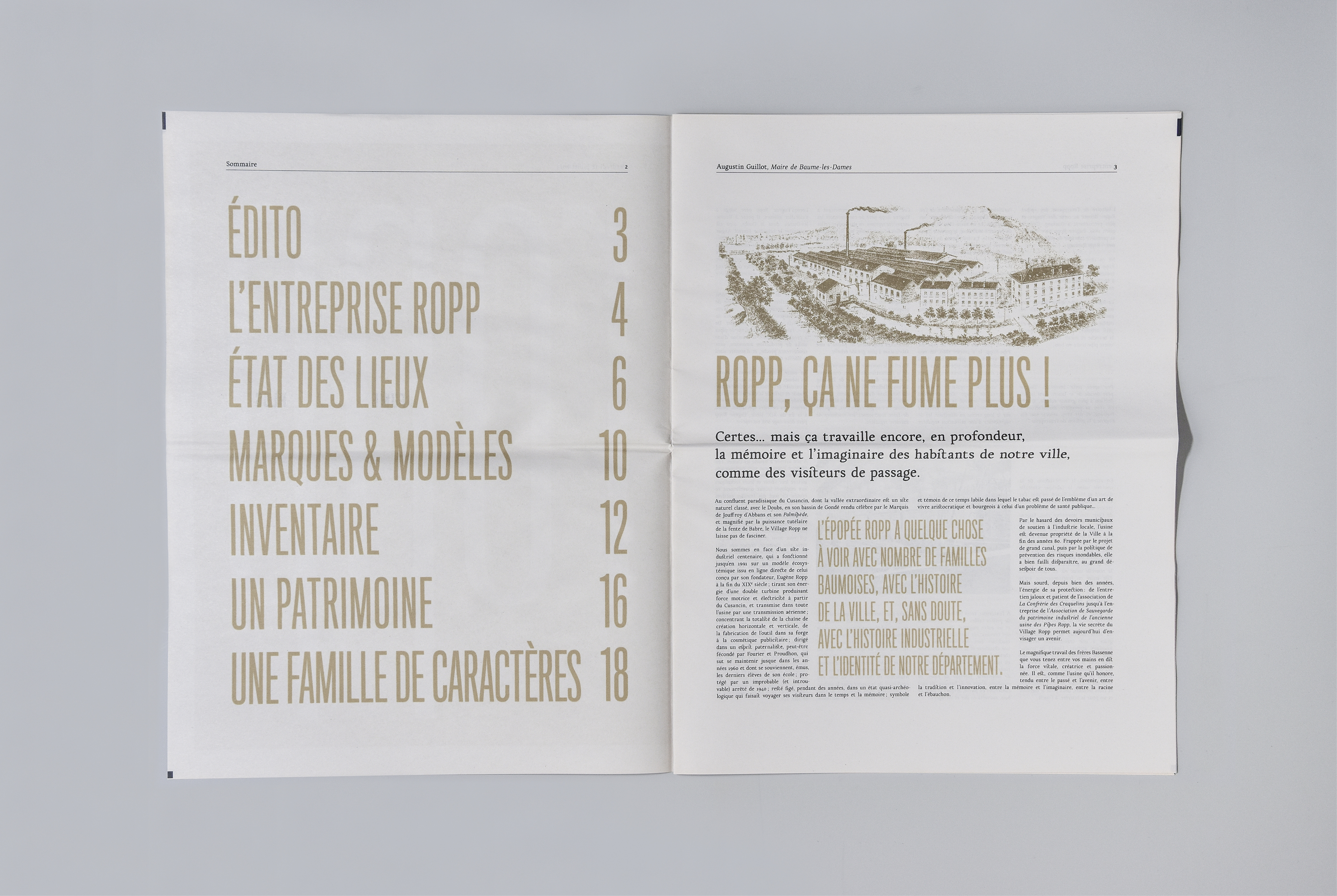 Papier: Magno natural 110g, condat silk 150g, cocoon 350g Typographies: Ropp + Titling GothicImpression: IME, Baume-les-Dames
