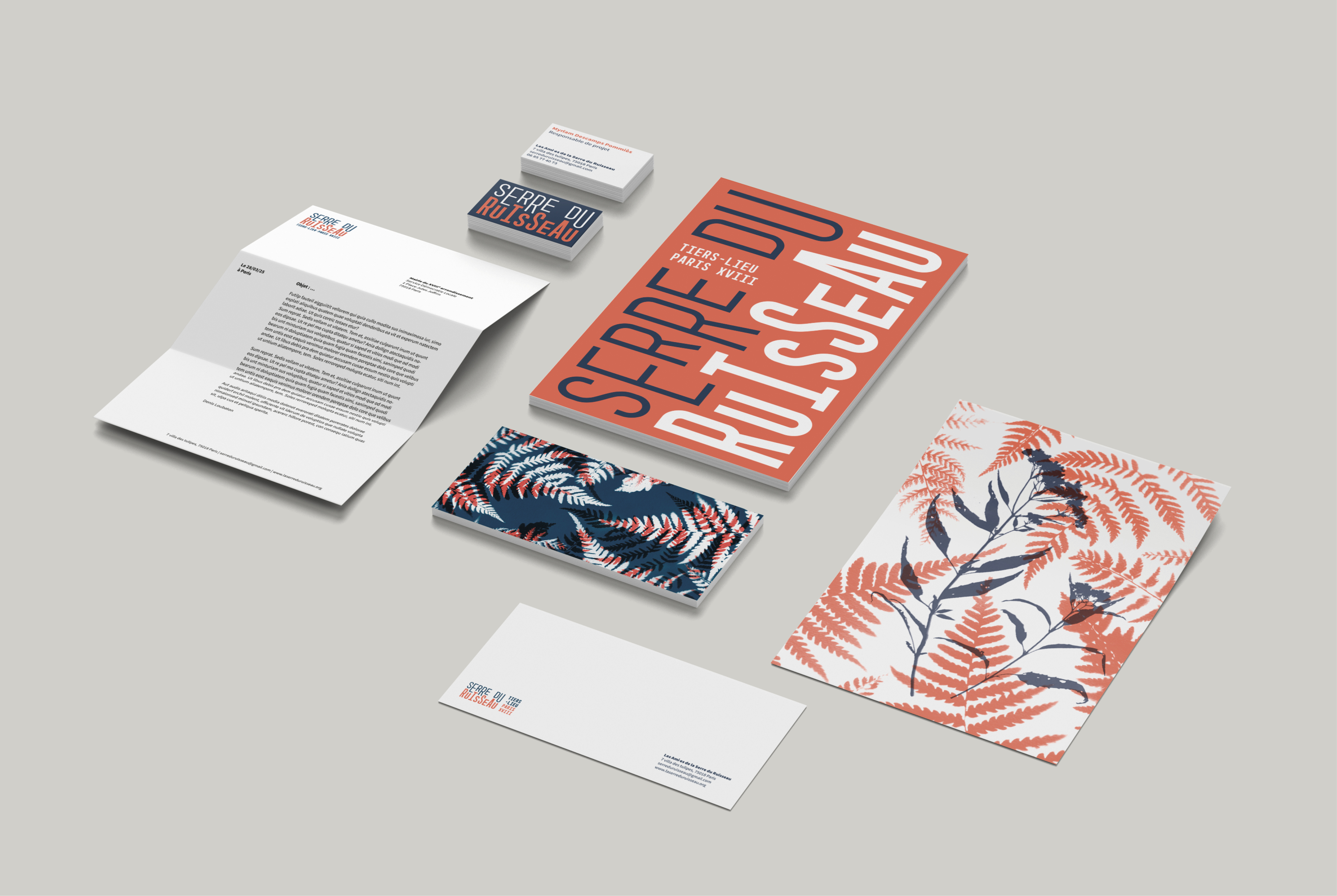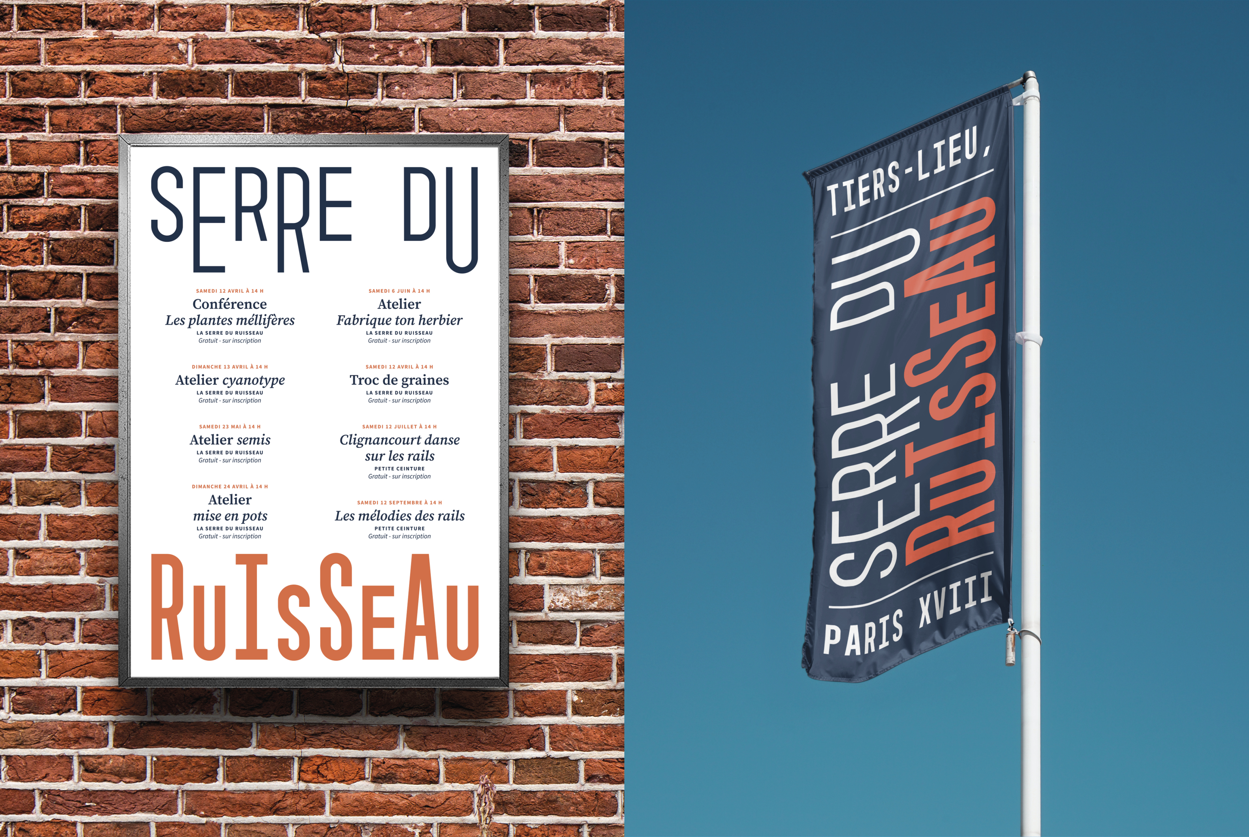 Ce sont ces aspects morphologiques (vertical) et techniques (mécanique et évolutif) qui ont guidé le choix des ingrédients graphiques constitutifs de l’identité visuelle, à travers l’utilisation d’une famille typographique variable, suggérant la croissance des racines et des plantes. Un logotype compact et vivant découle de cette approche et est associé à différentes couches de cyanotypes de végétaux qui font écho à la lumière qui pénètre dans la serre.